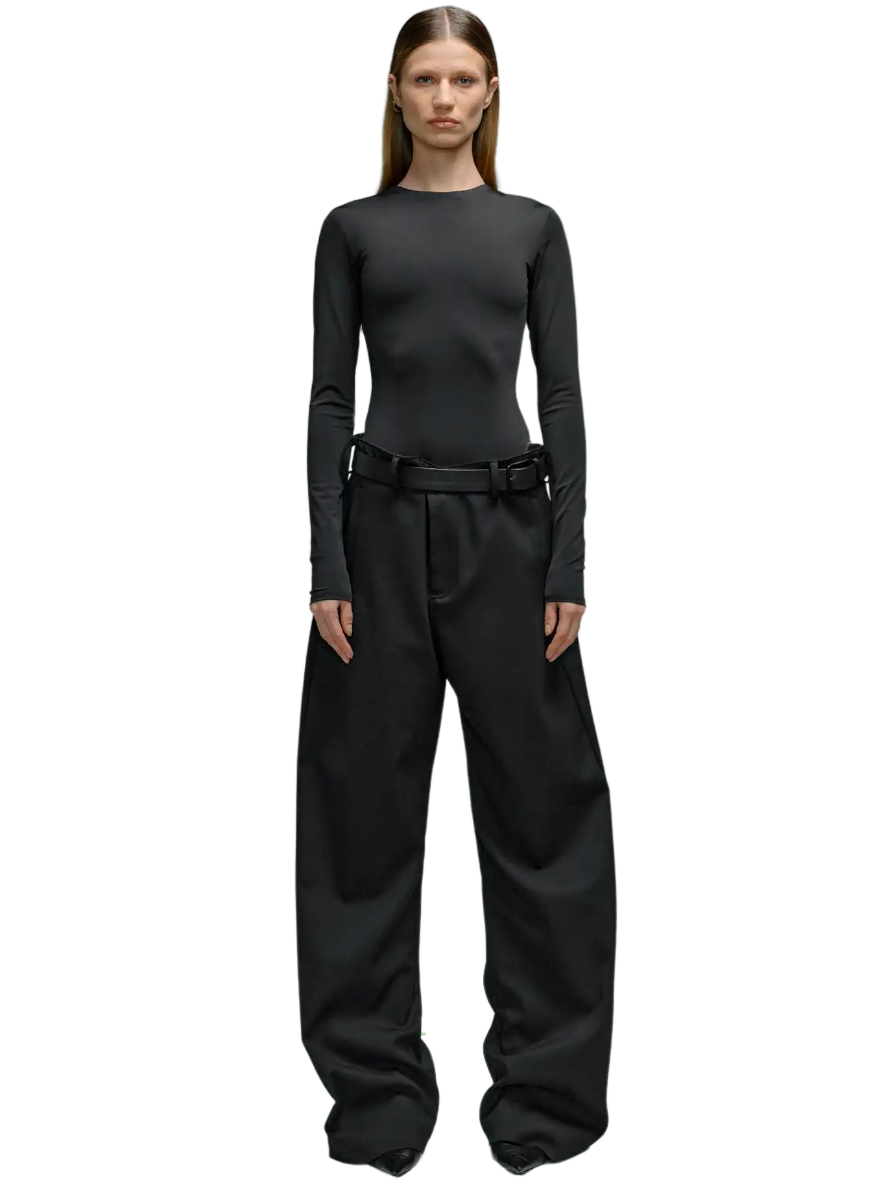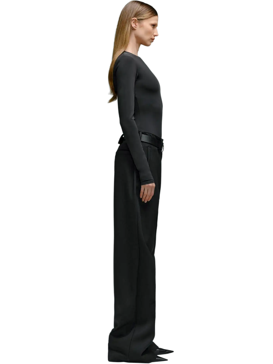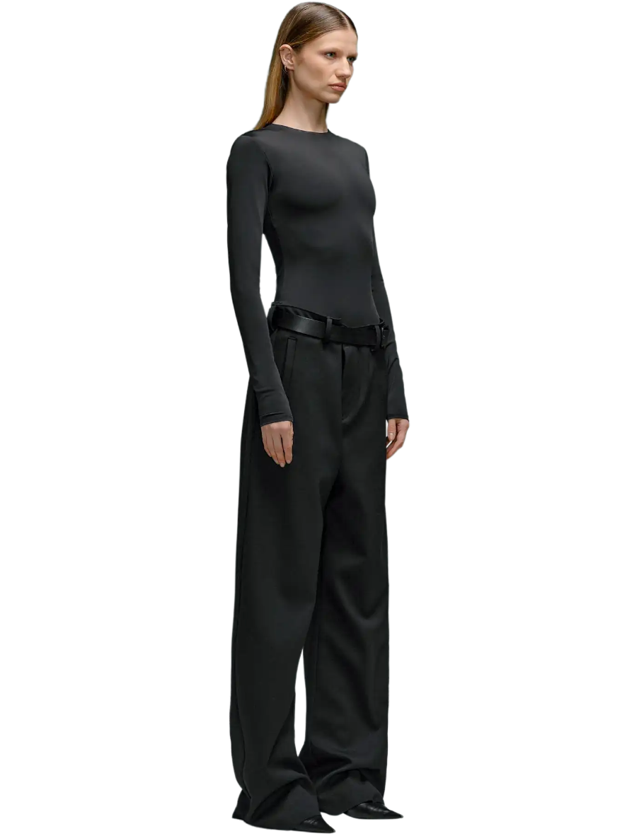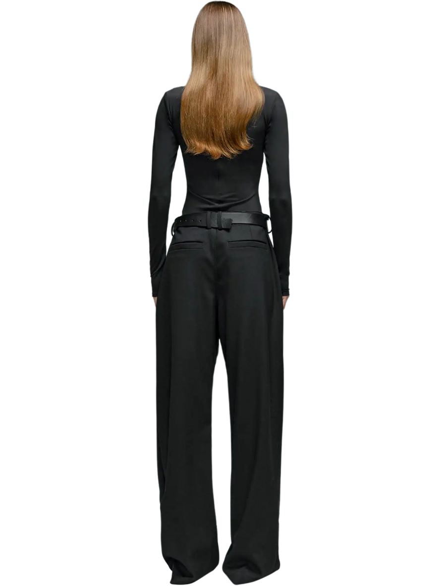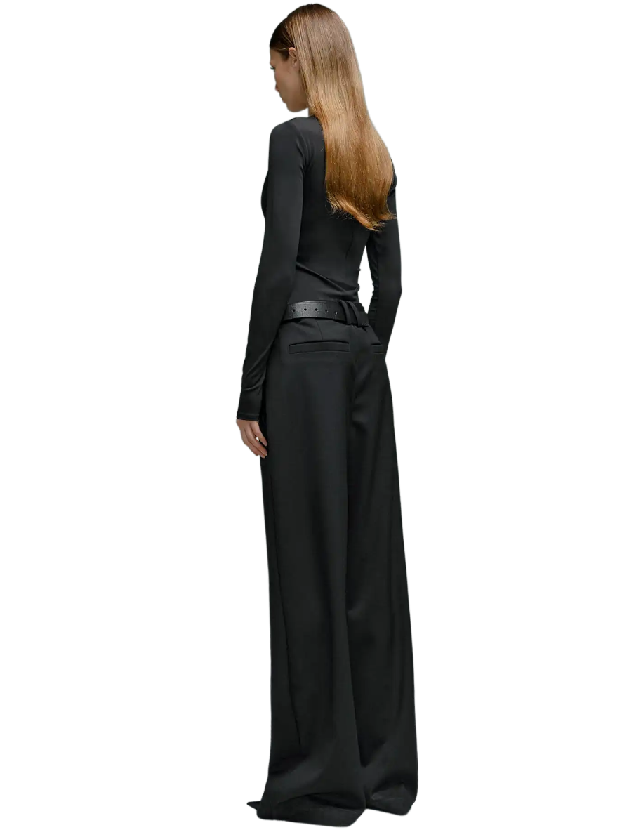Every detail of the Montauk trousers speaks to our commitment to excellence. The luxurious black wool construction is accentuated by sleek side waist buckle detailing in a polished silver tone, elevating the trousers with a touch of sophistication. Pleated detailing adds depth and dimension to the silhouette, while the wide leg flared cut effortlessly blends classic style with contemporary flair.