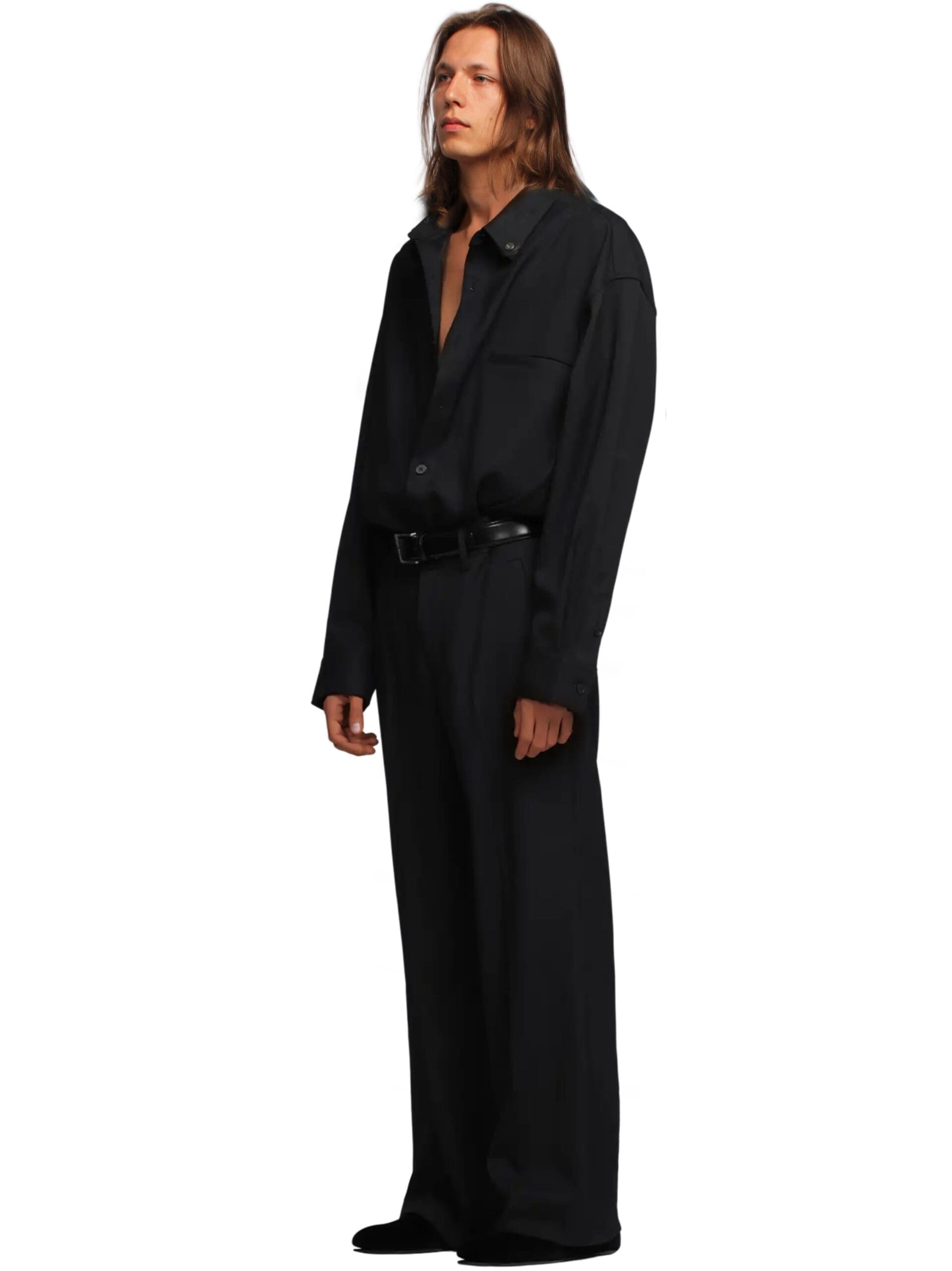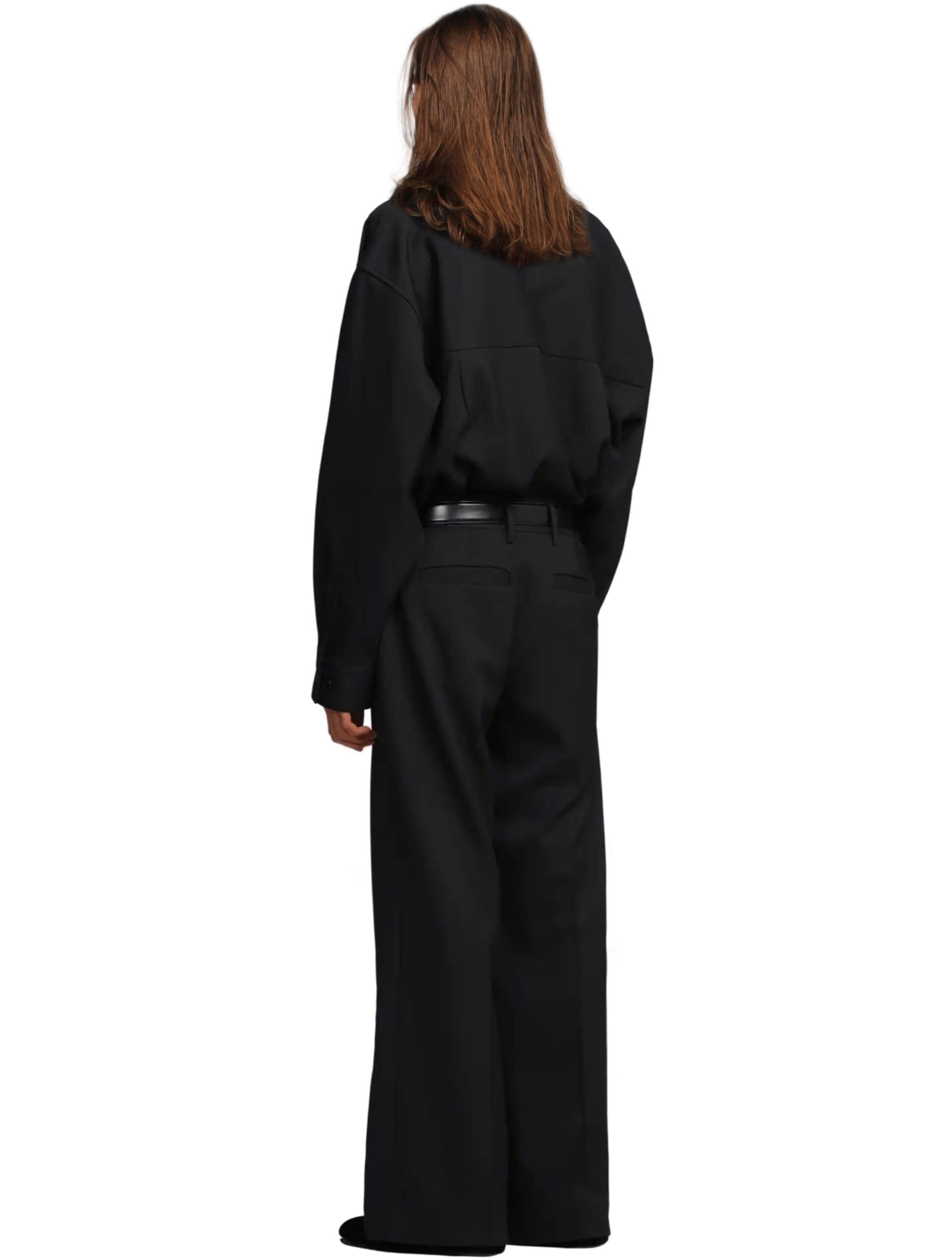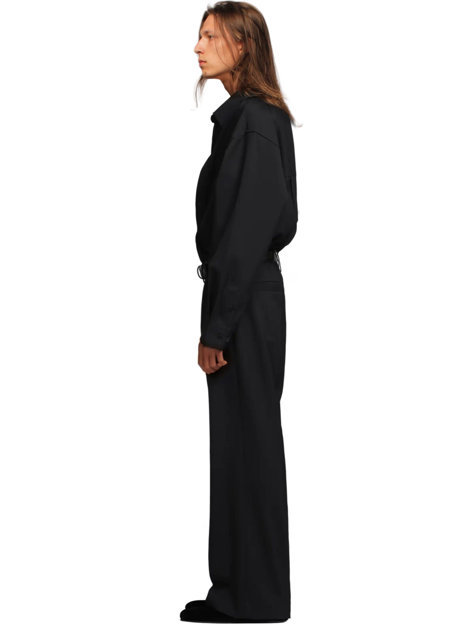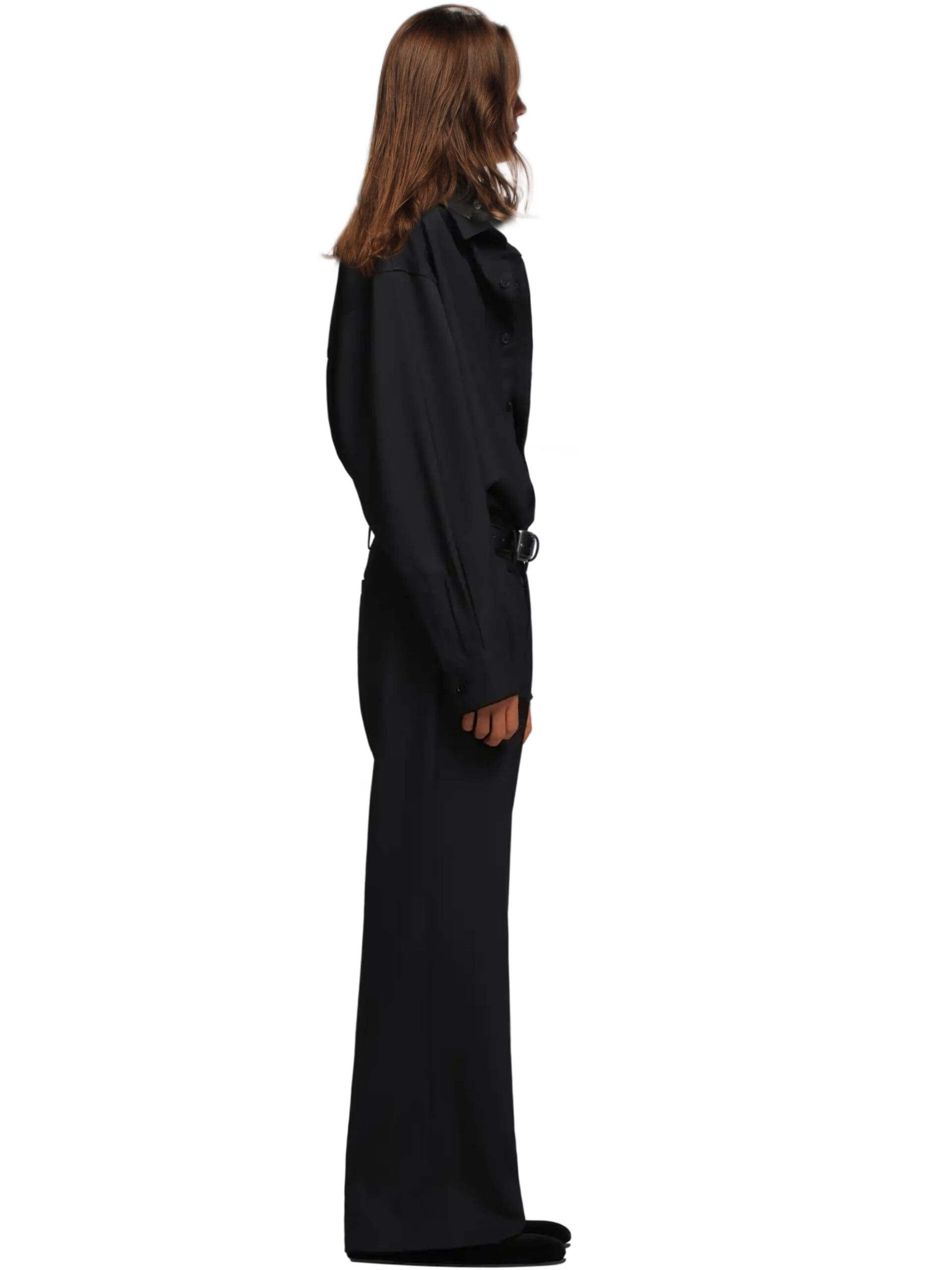 Every detail of the Montauk trousers speaks to our commitment to excellence. The luxurious black wool construction is accentuated by sleek side waist buckle detailing in a polished silver tone, elevating the trousers with a touch of sophistication. Pleated detailing adds depth and dimension to the silhouette, while the wide leg flared cut effortlessly blends classic style with contemporary flair.