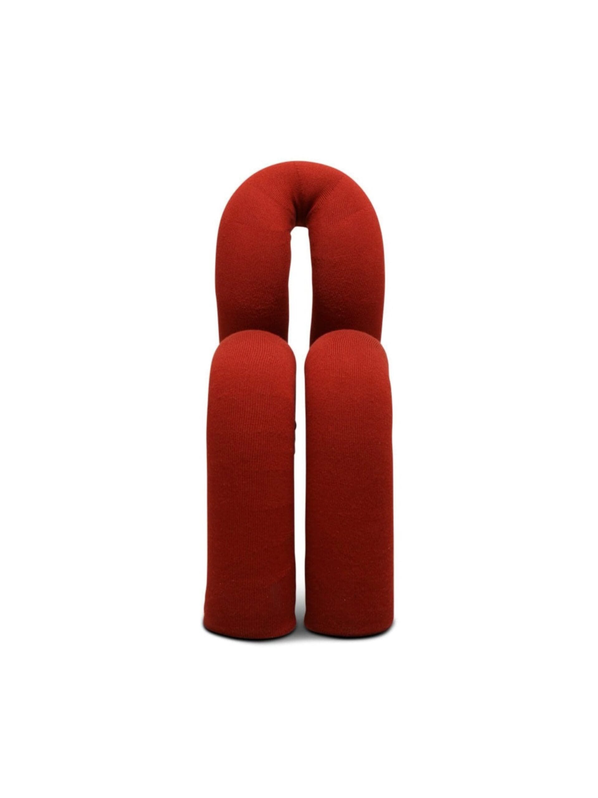 The form is rigid and structural, yet cushioned and soft; a curvy, sensual take on playful soft sculpture. It is surfaced in a one-piece custom wool fabric created specific to the form. The curves are constructed into the fabric itself.