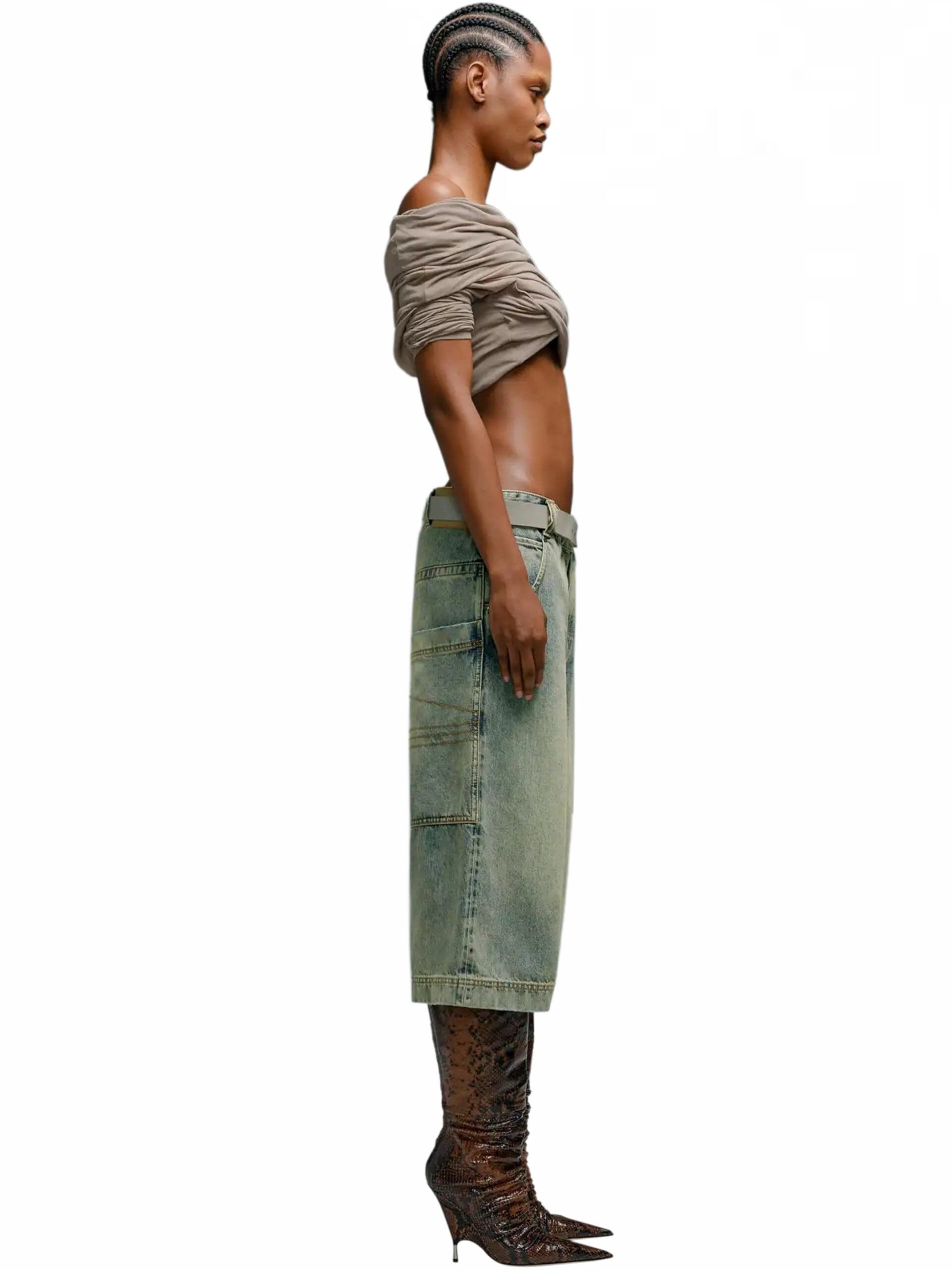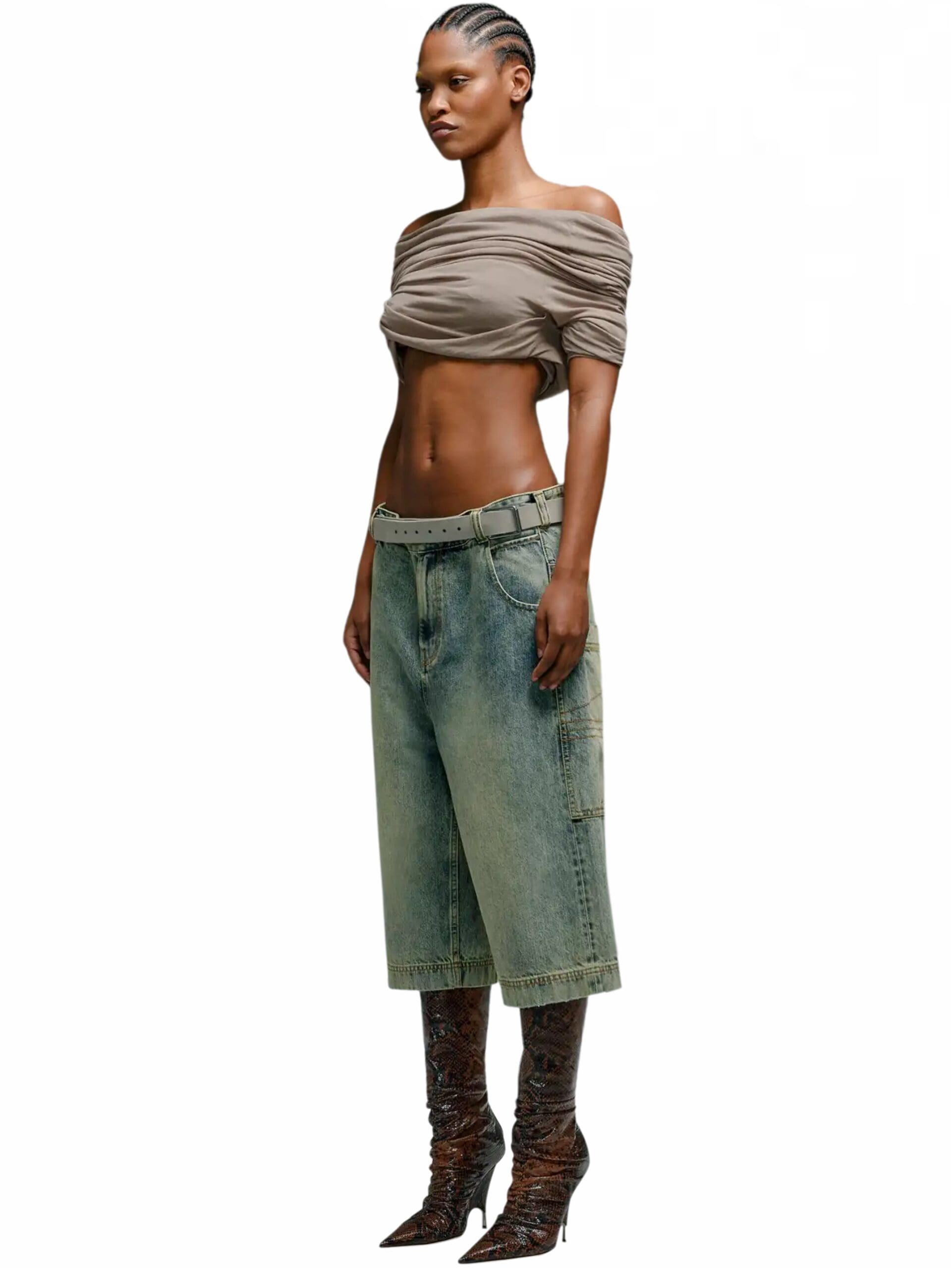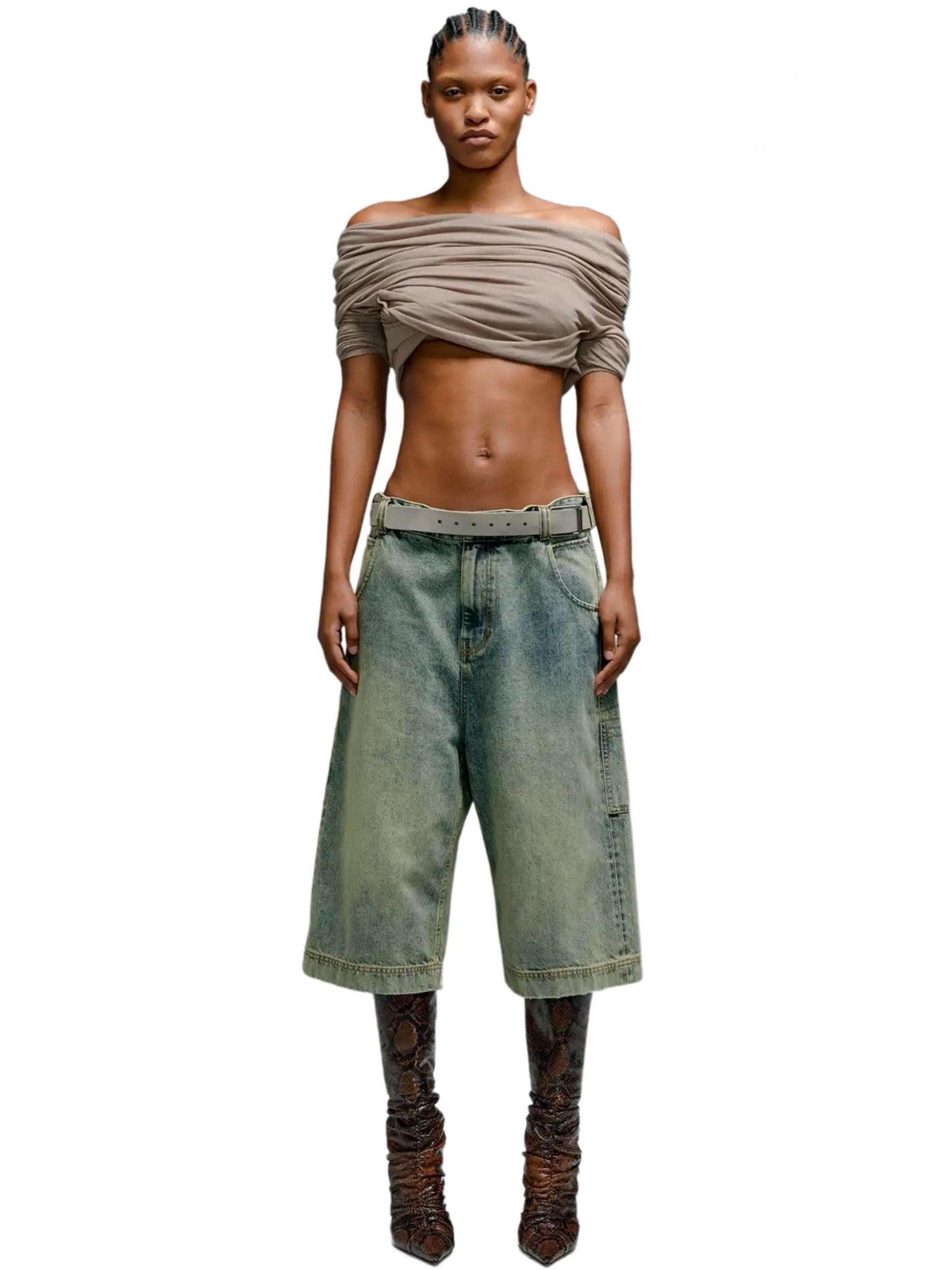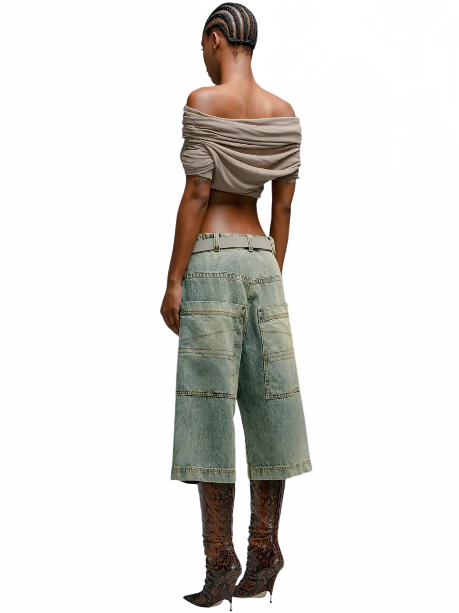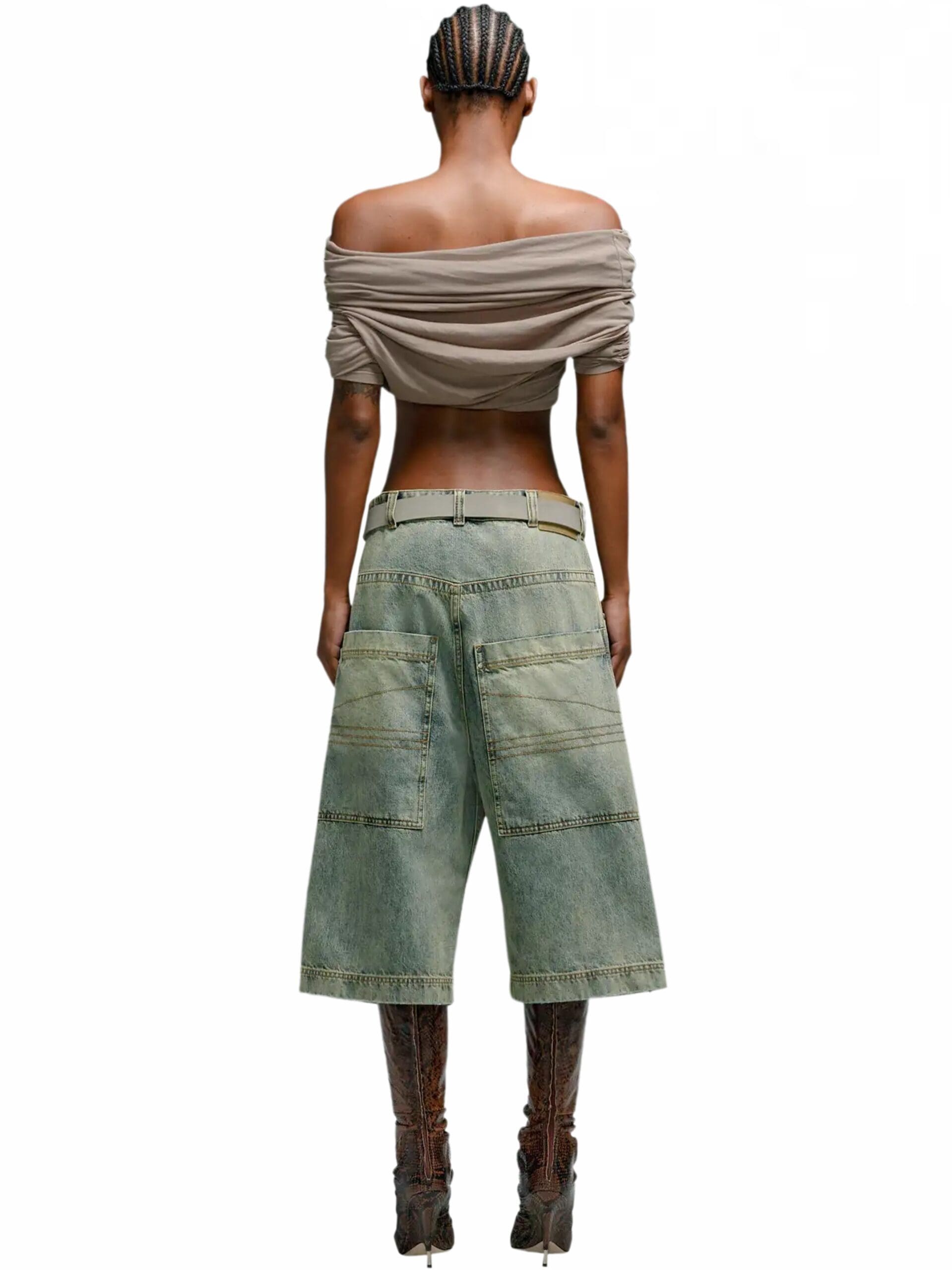 Inspired by nostalgic references, these shorts boast a high-rise waist and a bleached denim finish, lending a casual yet modern appeal. The flared style adds a hint of vintage charm, infusing each pair with a unique and stylish edge.