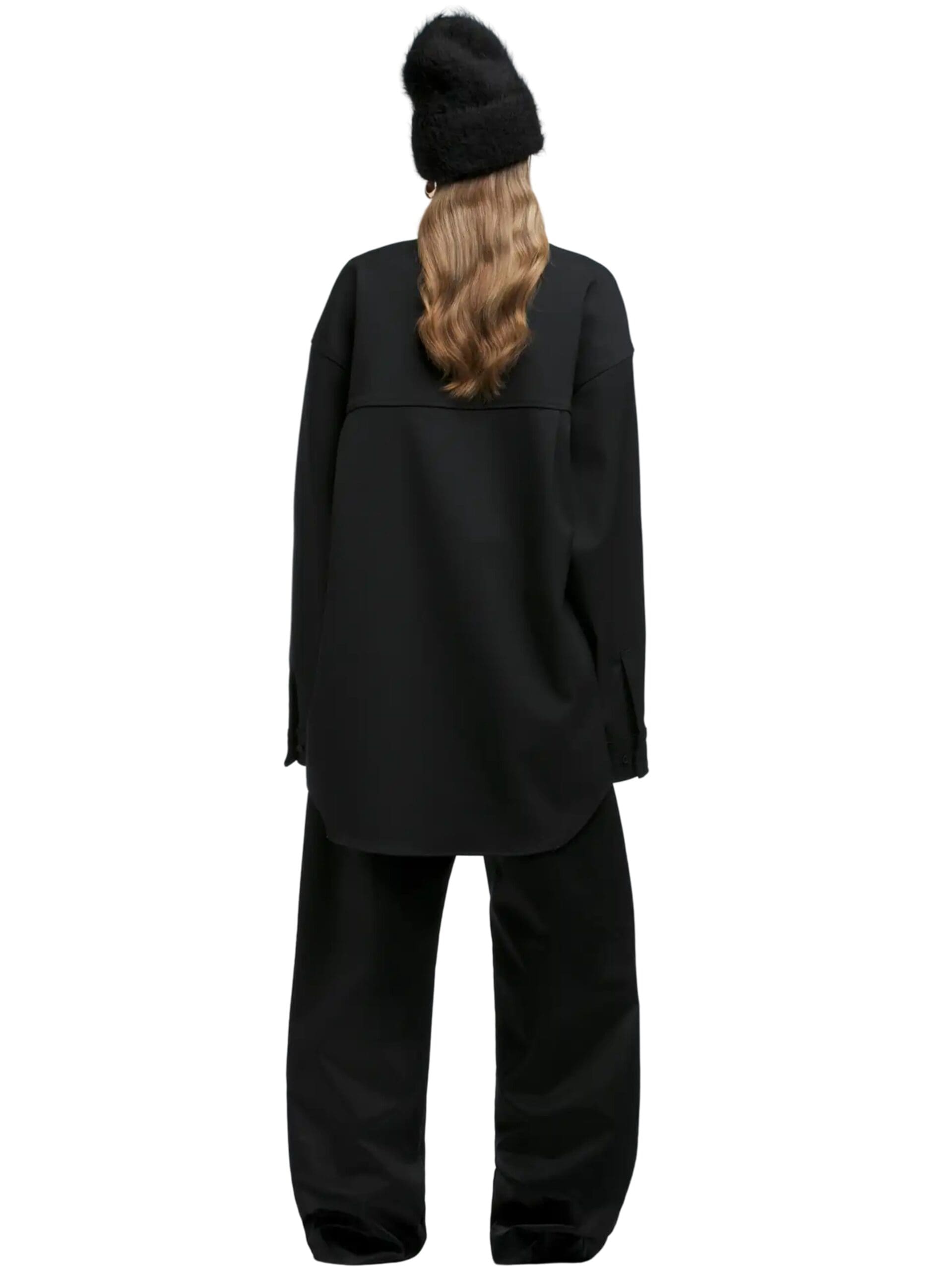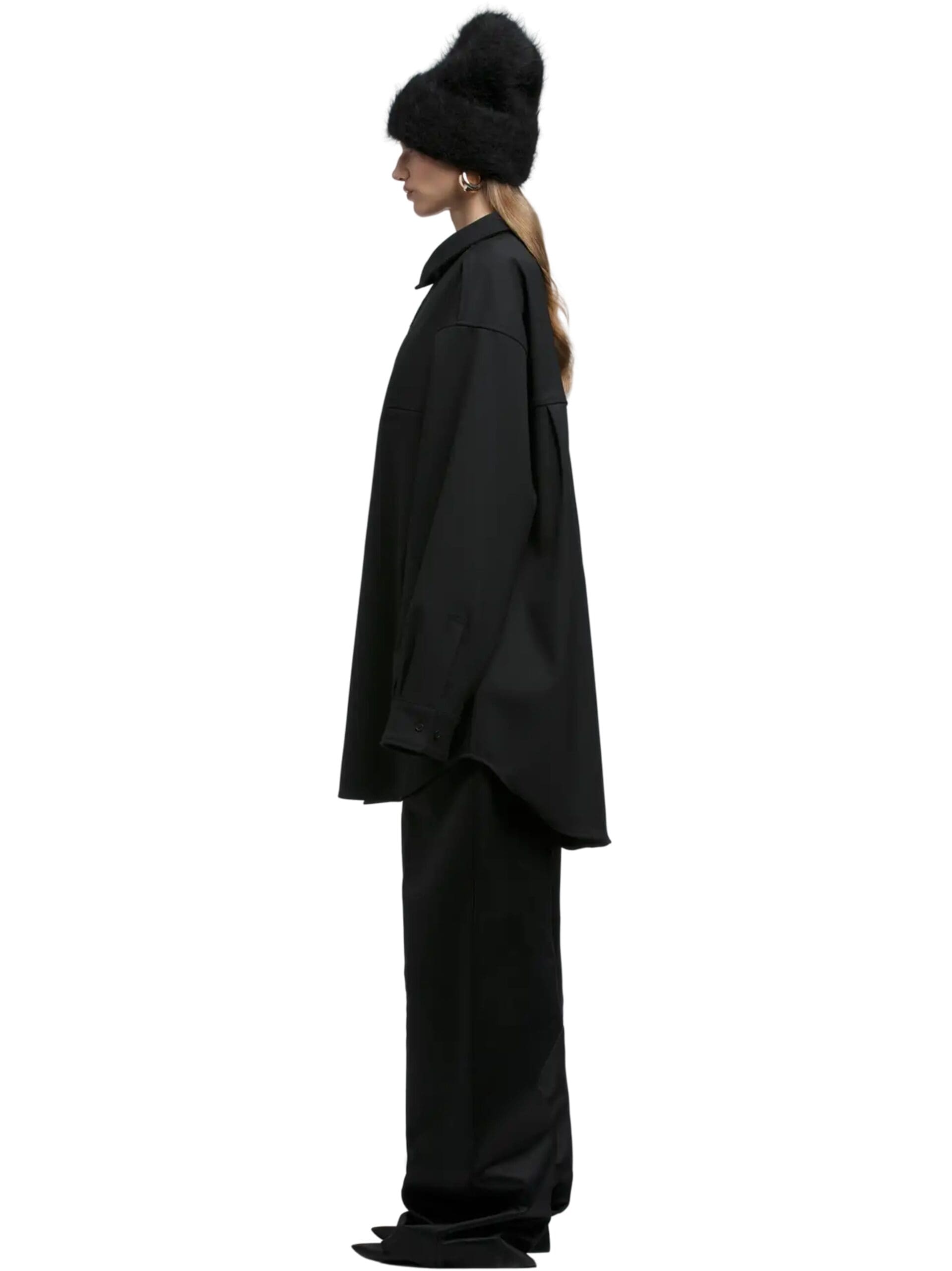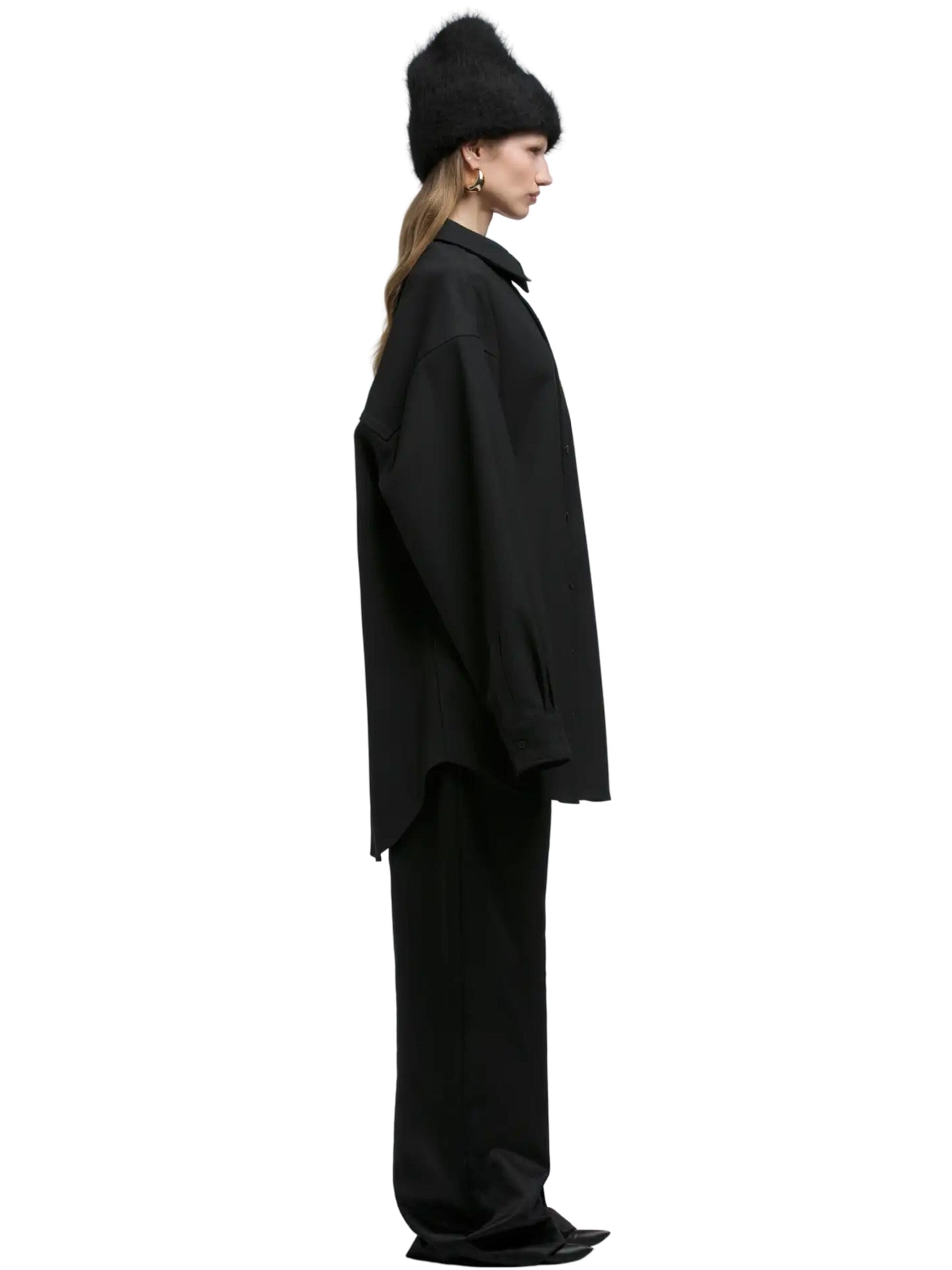 Forget everything you thought you knew about wool. The Burning in Calabasas Merino Wool Shirt is redefining luxury and performance with its lightweight, comfortable, and refined design. Crafted from ultra-fine S120s 2-ply Merino wool, this shirt offers astonishing natural performance while exuding sophistication. Woven by the renowned wool masters at Reda, a 150-year-old Italian mill, this shirt is more than just a garment—it’s a revolution in wool.this black oversized tailored shirt jacket features a pointed collar, long sleeves, and a single chest pocket fastened by a button front closure. crafted of wool, it features dropped shoulders and a straight hem extending to mid-thigh for a relaxed silhouette.