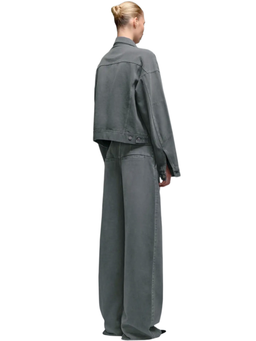 This Utility Jacket is designed for functional versatility, featuring flap pockets with additional side entry pockets and hidden snap closures for a secure fit. Folded pleats at the back create volume, enhancing the jacket’s distinctive silhouette. The ‘strike through’ stitch on shoulder loops adds an extra detail, exemplifying the fusion of style and utility.